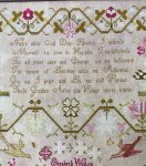 This reproduction sampler has been charted and stitched by Sandra Moffitt from Hands Across the Seas Samplers. The design area is 433 stitches wide x 449 stitches high. The instructions include conversions for Soie d'Alger, DMC and NPI threads and linen sizes 28, 30,32,36,40 and 46 count.